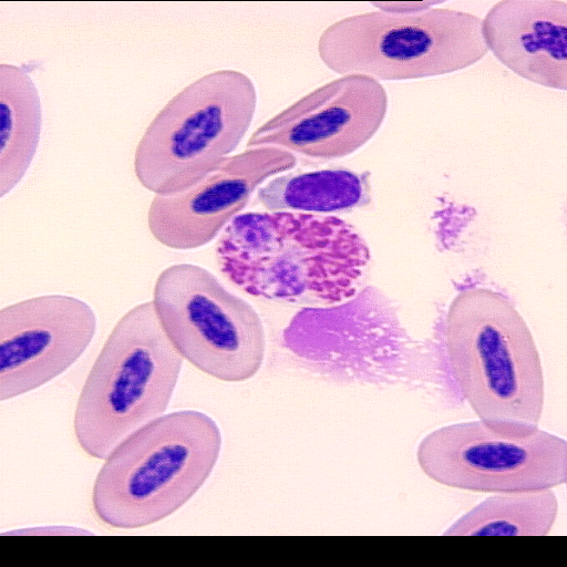 (EN) : One thrombocyte and one eosinophil (Whole mount, Wright's x100, Slide B5.6c1-4 G3): See the rod-shaped granules in the cytoplasm of eosinophil.