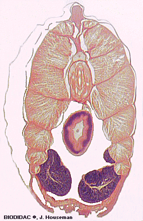(EN) : Cross section of the body through the intestinal region showing the dorsal fin (at the top), dorsal nerve cord, notochord, myomeres/myosepta, lumen of intestine, gonads, atrium, and metapleural folds.
