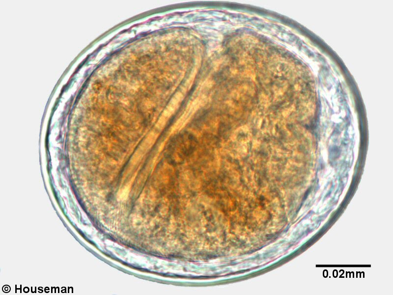 (FR) : Stade de vie de la métacercaire montrant une douve juvénile en développement à l'intérieur.