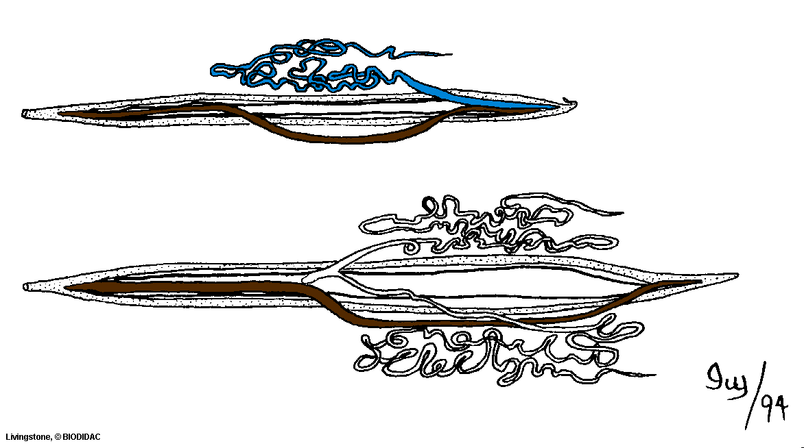 (FR) : Anatomie interne d'un ascaride mâle (en haut) et d'une femelle ascaride (en bas): Systèmes reproducteur et digestif sont démontrés par différentes couleurs.
