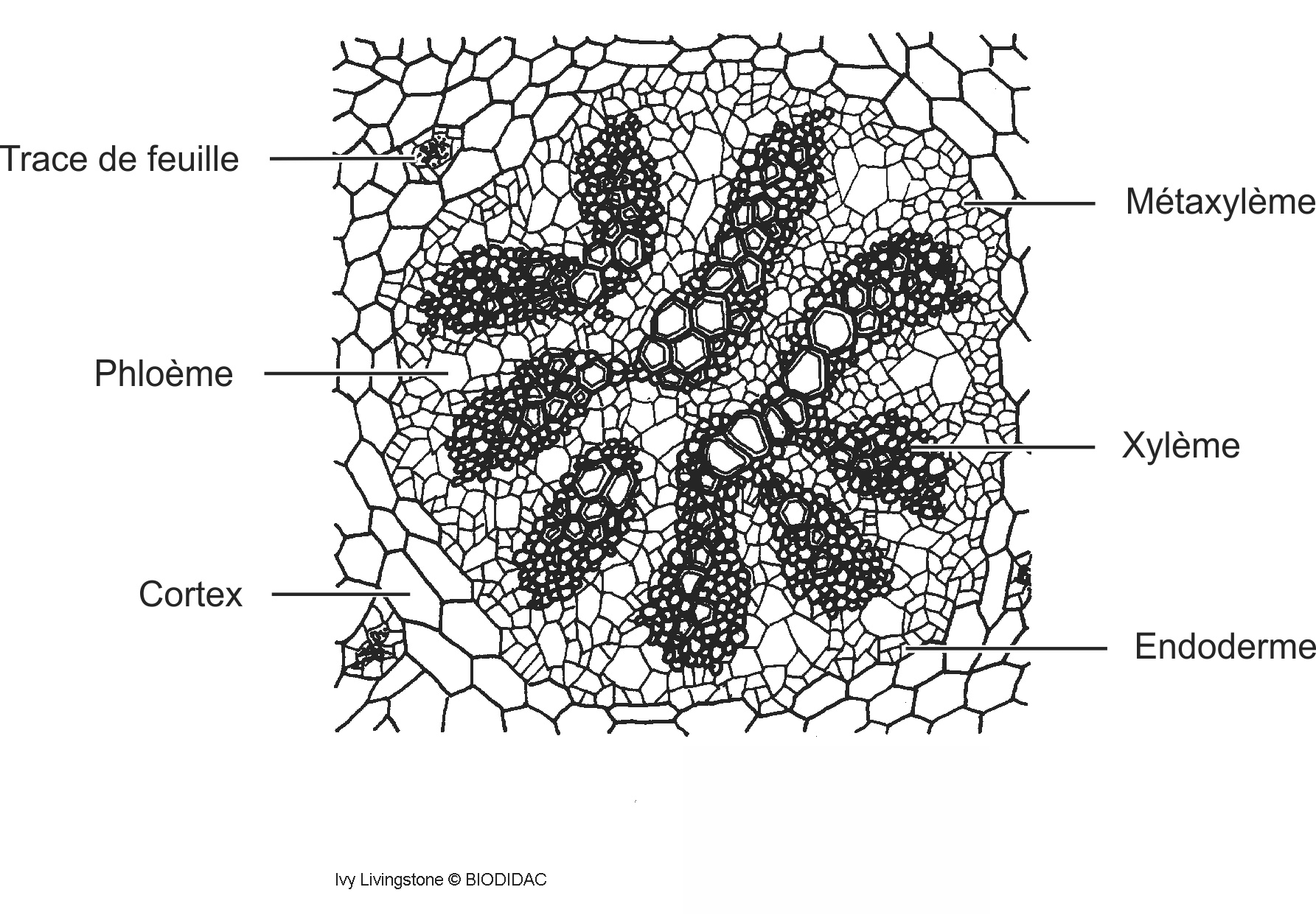 Étiquettes (FR) : Endoderme, Métaxylème, Xylème, Trace de feuille, Cortex, Phloème