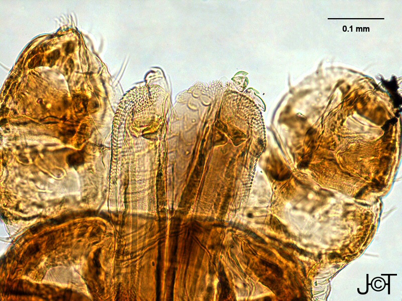 (EN) : Close-up ventral view of the mouthparts from the body tagma, capitulum.