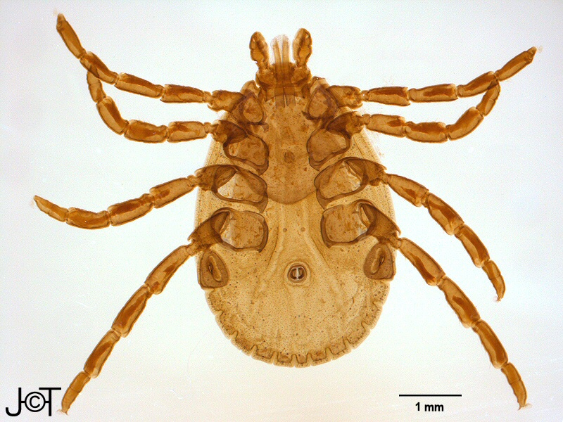 (FR) : Vue ventrale de l'anatomie externe d'une tique femelle.