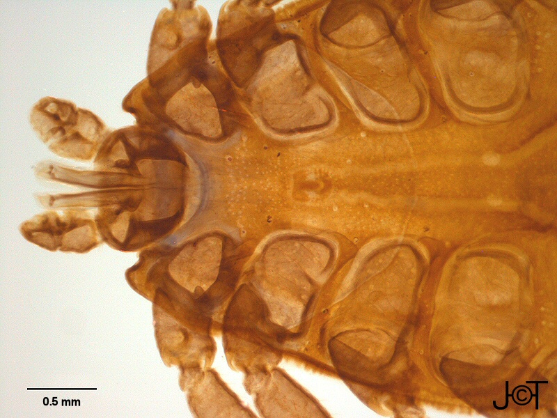 (EN) : Ventral view of the two body tagmata, capitulum (with its mouthparts) and idiosoma (with its gonopore and part of its walking legs).