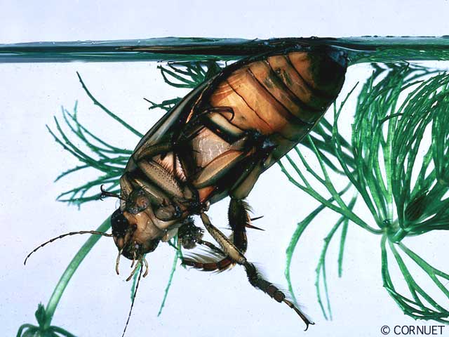 (EN) : Method of respiration: The adult renews its air reserves by piercing the surface film of the water with the tip of its abdomen, then the air is sucked in under the elytra, where the spiracles open.