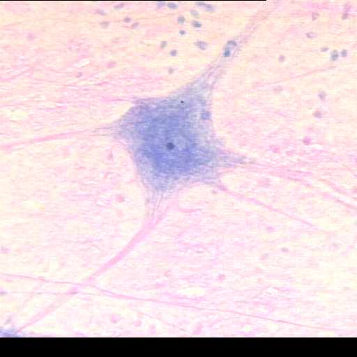 (FR) : Frottis de moelle épinière bovine (Montage entier, Coloration de Nissl, x25, Lame 19-64 F1.1): Neurone provenant d'un frottis de la matière grise et montrant son péricaryon (corps cellulaire) et quelques extensions qui ont été préservées dans cette préparation.