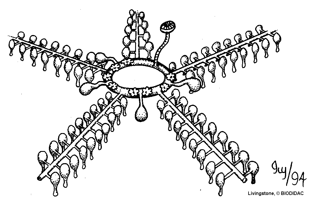 Labels (EN) : Lateral canal, Sucker, Tiedmann's body, Tube feet, Ampulla, Radial canal, Ring Canal, Polian vesicle, Stone canal, Madreporite