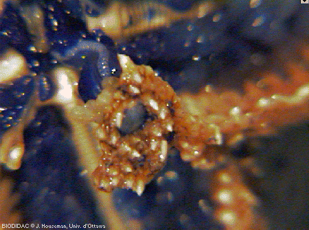 (FR) : Anatomie interne: Détail de la jonction du madrépore avec le canal du madrépore et le canal circulaire. Un colorant bleu a été injecté dans le système aquifère.