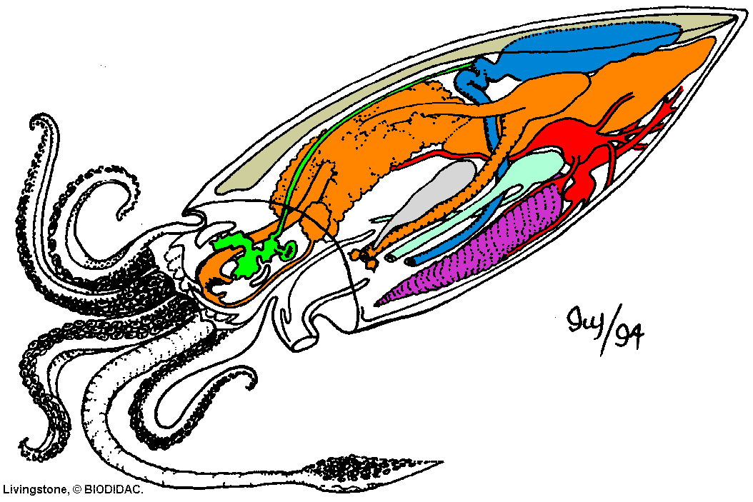 Labels (EN) : Brain, Tentacle, Beak, Radula, Siphon, Anus, Intestine, Ctenidia, Gonoduct, Nephridium, Branchial (gill) heart, Systemic heart, Mantle cavity, Esophagus, Ink sac, Digestive glands, Stomach, Gonad, Caecum, Pen (shell), Mantle, Salivary gland, Visceral ganglion, Pedal ganglion, Cerebral ganglion, Suction disks, Arms