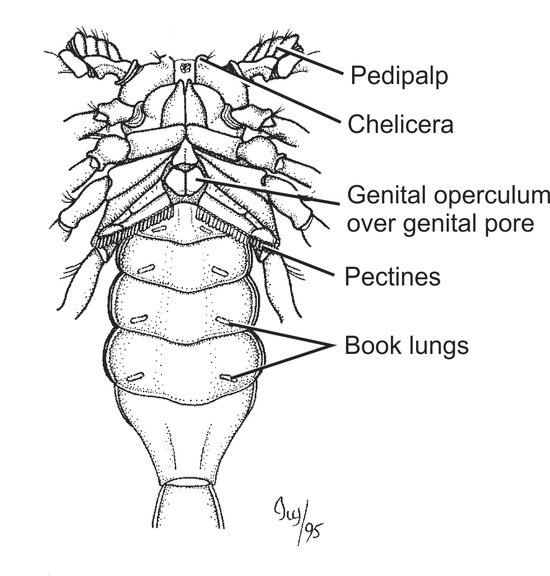 Labels (EN) : Book lungs, Pectines, Genital operculum over genital pore, Chelicera, Pedipalp