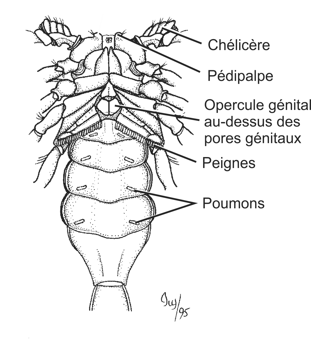 Étiquettes (FR) : Poumons, Peignes, Opercule génital au-dessus des pores génitaux, Chélicère, Pédipalpe