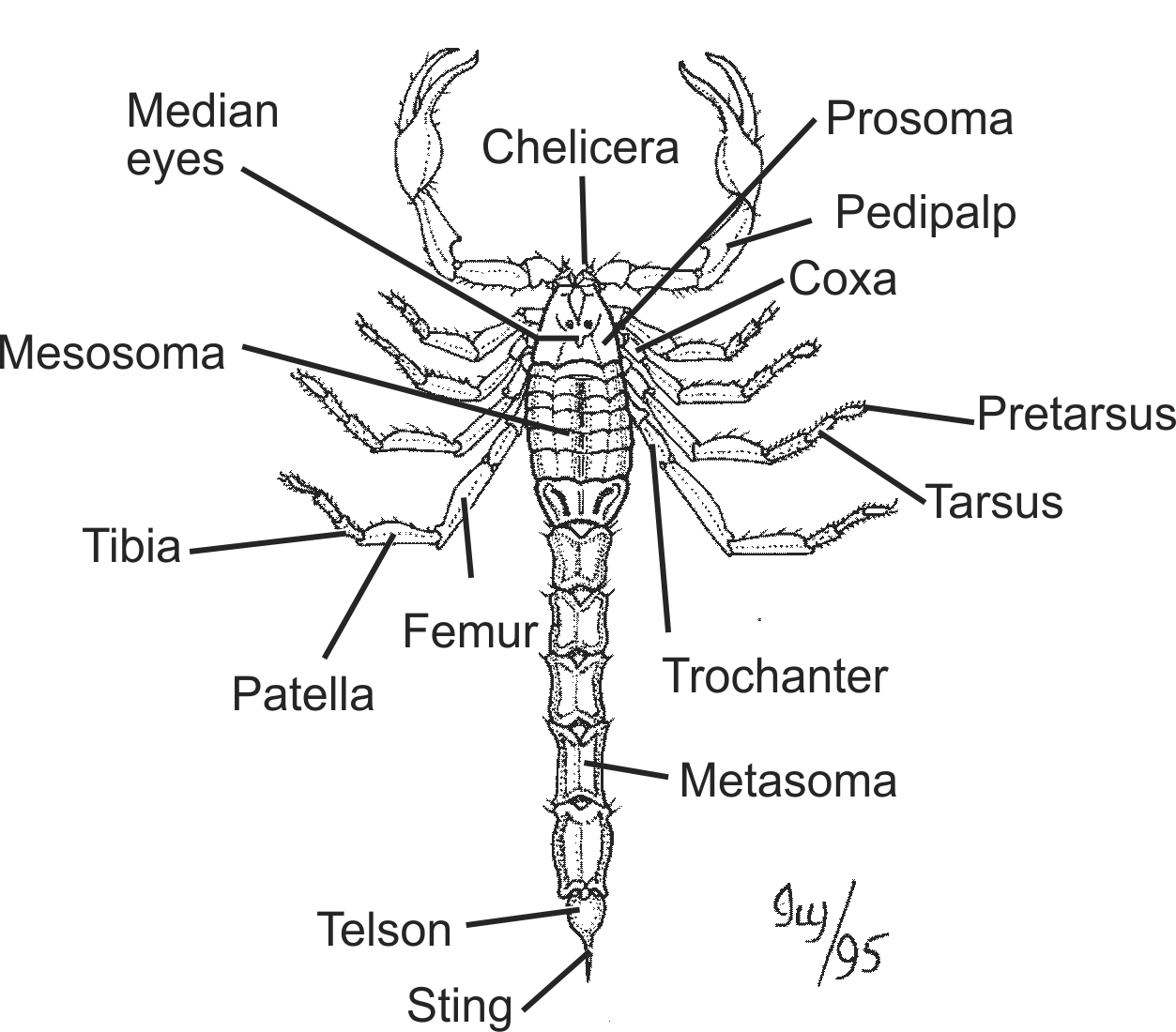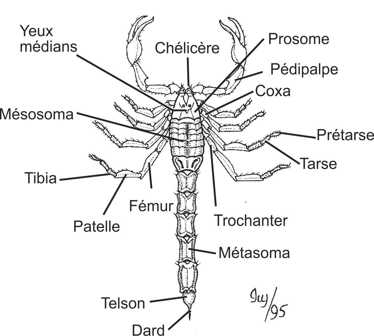 Étiquettes (FR) : Prosome, Mésosoma, Métasoma, Chélicère, Pédipalpe, Coxa, Prétarse, Tarse, Trochanter, Dard, Telson, Fémur, Patelle, Tibia, Yeux médians