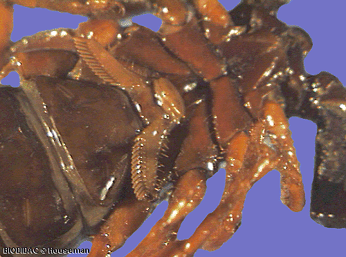 (FR) : Anatomie externe : Détail de la surface ventrale montrant les pectines, qui sont des organes chimio-sensoriels en forme de peigne utilisés pour la navigation, la localisation des proies et la recherche d'un partenaire.