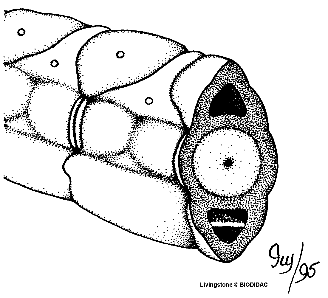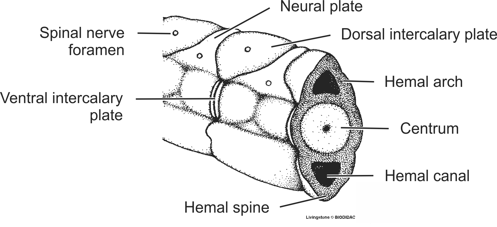 Étiquettes (FR) : Foramen du nerf spinal, Plaque intercalaire ventrale, Apophyse épineuse hémale, Canal hémal, Plaque intercalaire dorsale, Plaque neurale, Arc hémal, Corps vertébral