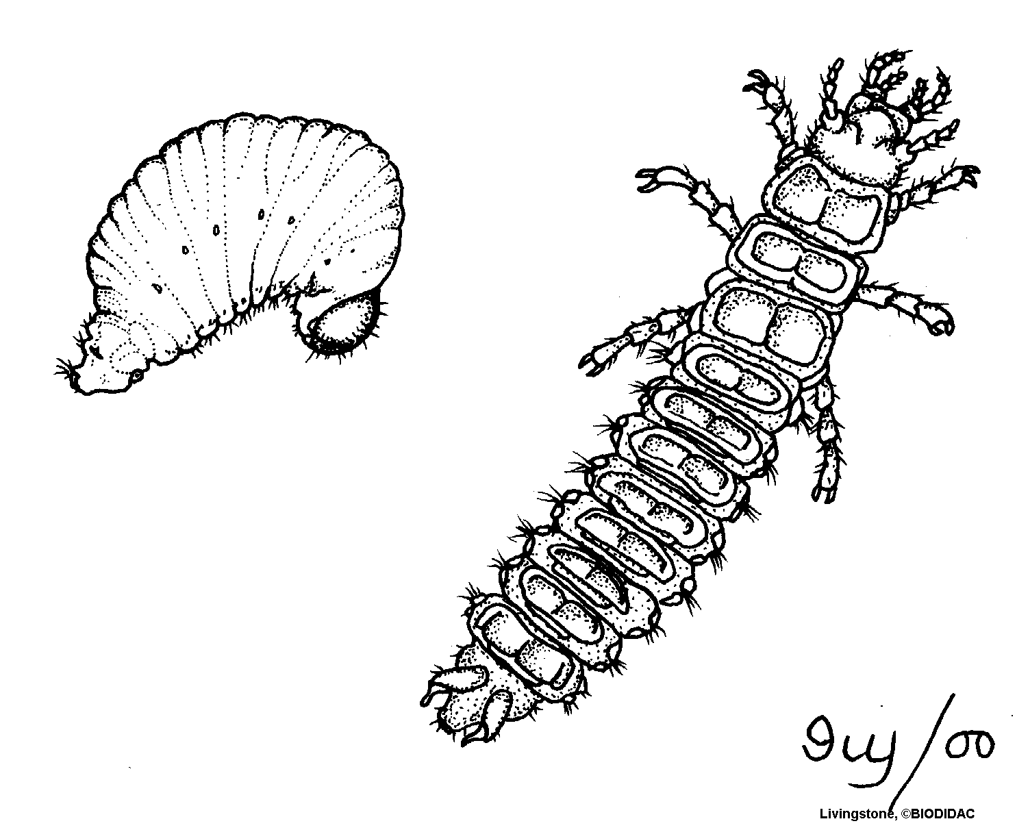 (FR) : Anatomie externe : Vue latérale d'une larve apode (caractérisée par son absence de vraies pattes pour la locomotion, une cuticule mal sclérosée et souvent une capsule céphalique réduite ; à droite) et vue dorsale d'une larve de carabe (caractérisée par ses longues pattes courbées et une grosse tête avec pièces buccales courbées ; à droite).