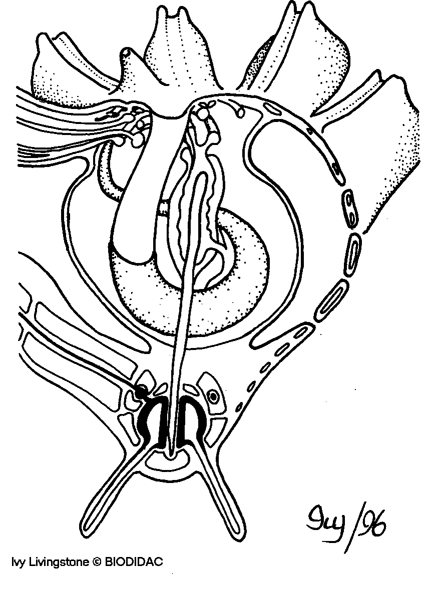 (EN) : Internal anatomy: Longitudinal section of the calyx showing the main systems.