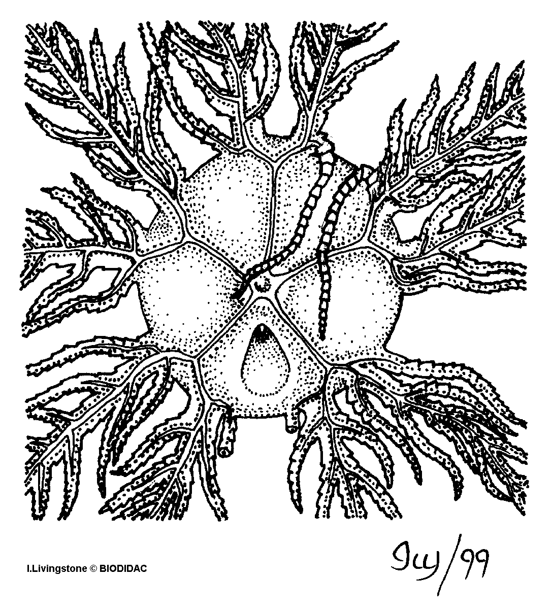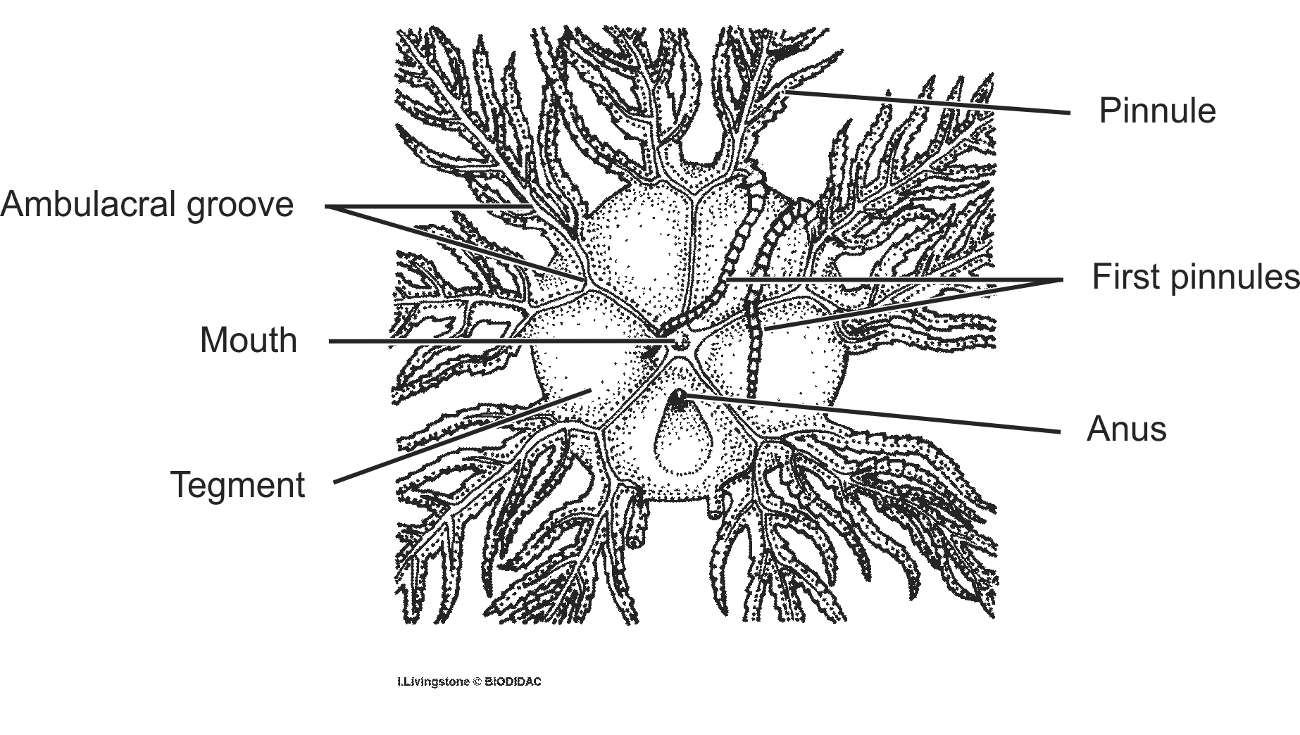 Étiquettes (FR) : Sillon ambulacraire, Bouche, Tegment, Anus, Premières pinnules, Pinnule