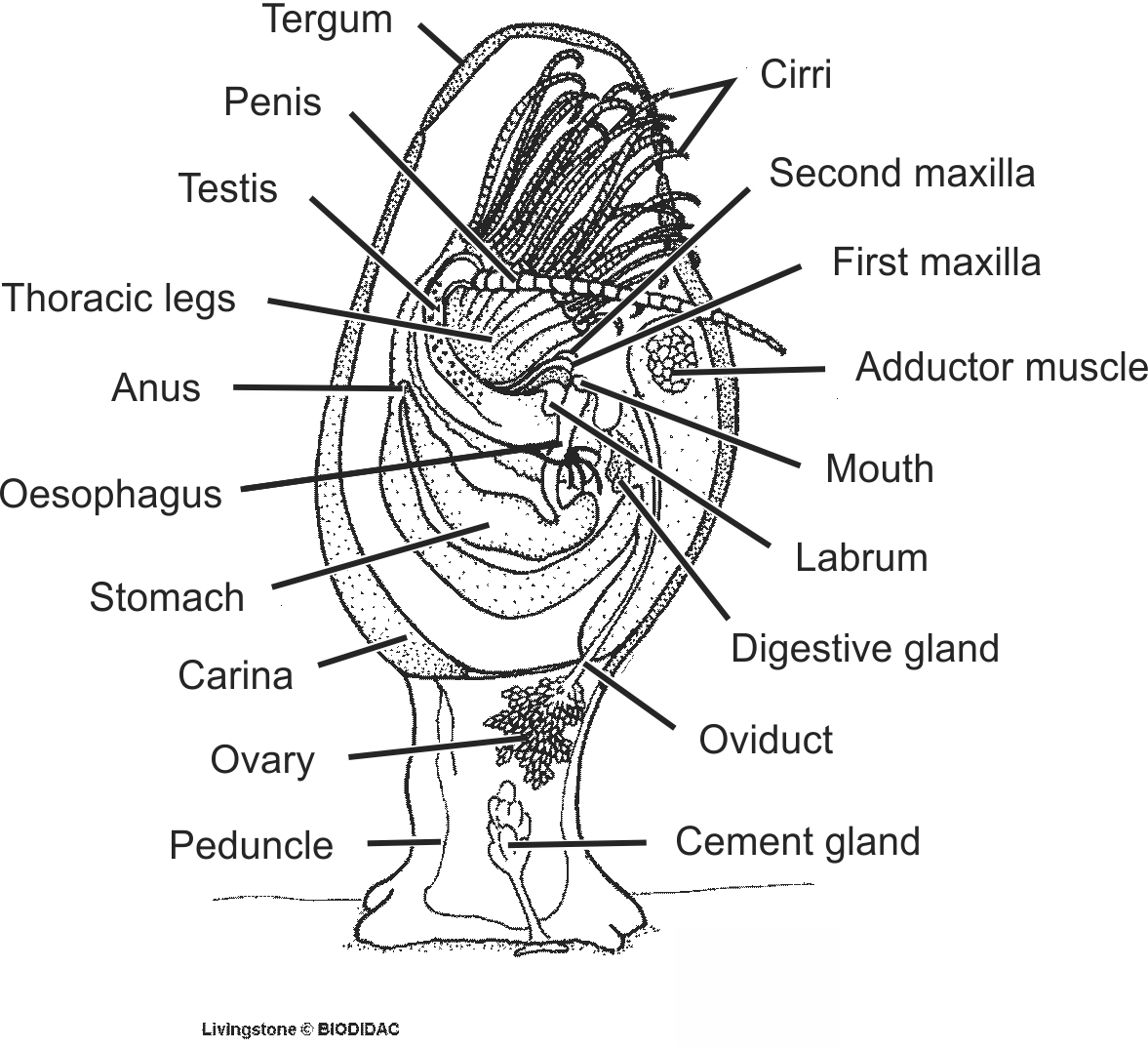 Labels (EN) : Peduncle, Carina, Stomach, Oesophagus, Anus, Testis, Thoracic legs, Cement gland, Ovary, Oviduct, Digestive gland, Labrum, Mouth, First maxilla, Second maxilla, Adductor muscle, Penis, Cirri, Tergum