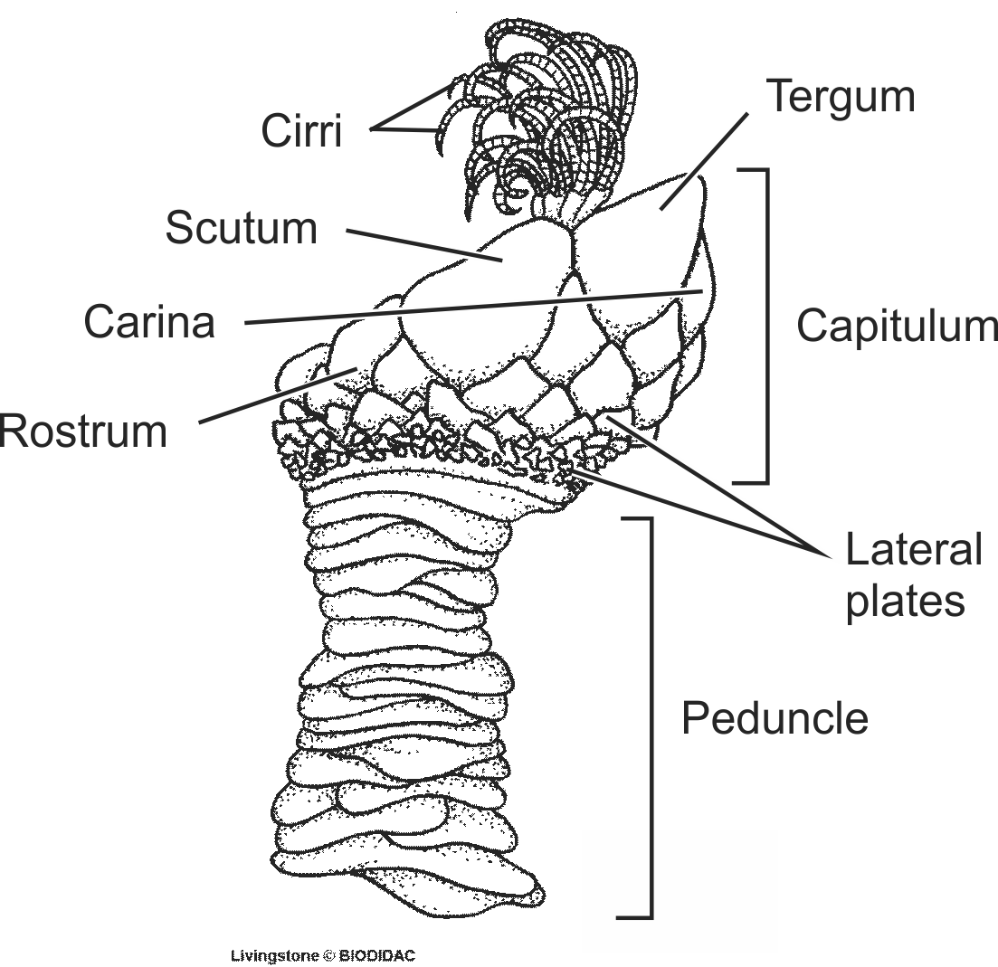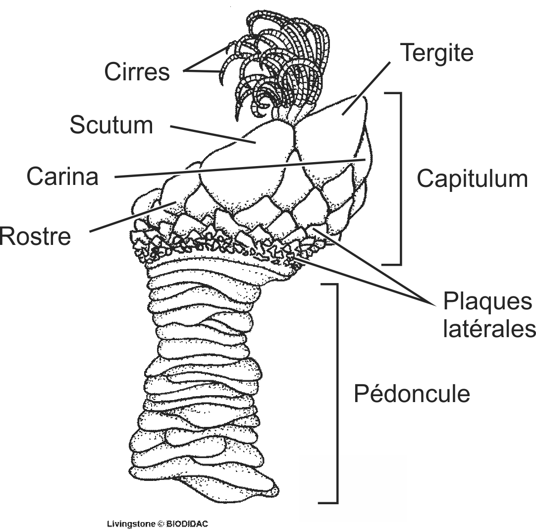 Labels (EN) : Rostrum, Scutum, Capitulum, Lateral plates, Peduncle, Carina, Tergum, Cirri