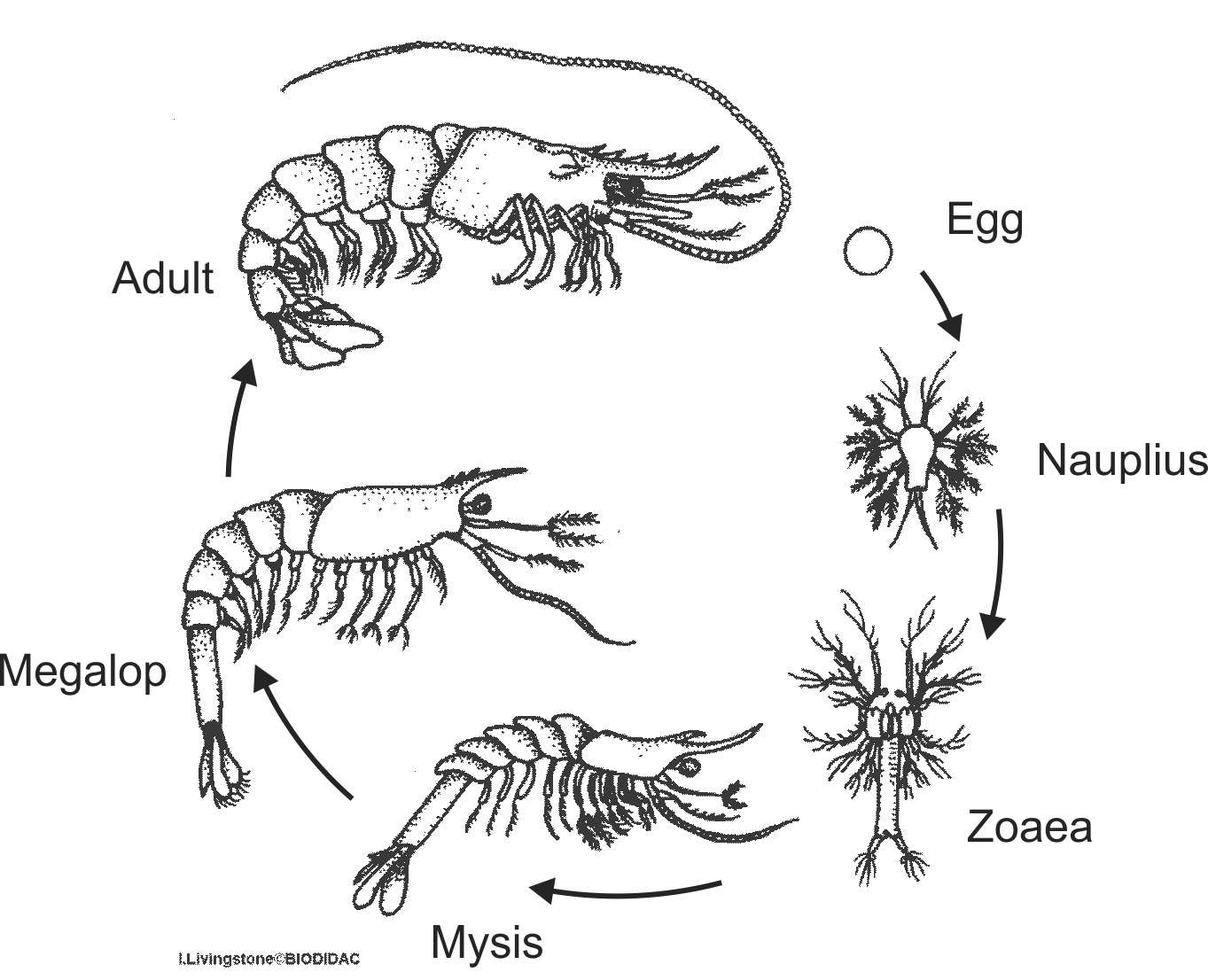 Labels (EN) : Mysis, Zoaea, Nauplius, Egg, Megalop, Adult