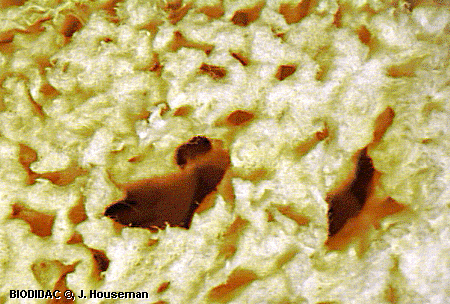 (EN) : Close-up view of a macerated and dried skeleton of a sponge showing the oscula.