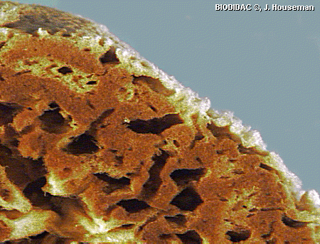 (EN) : Close-up view of a longitudinal section through a macerated and dried skeleton of a sponge showing the large efferent (excurrent) channels and the surface.
