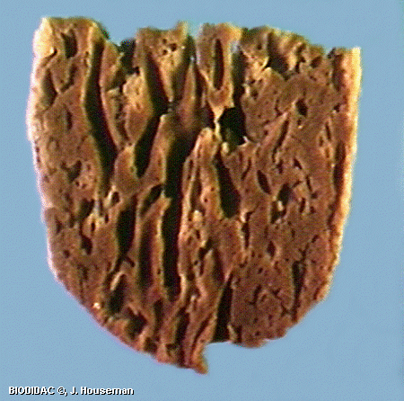 (FR) : Coupe longitudinale d'un squelette d'éponge macéré et séché montrant les grands canaux efférents.