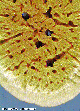 (EN) : Close-up view of a cross section through a macerated and dried skeleton of a sponge showing the large efferent (excurrent) channels.