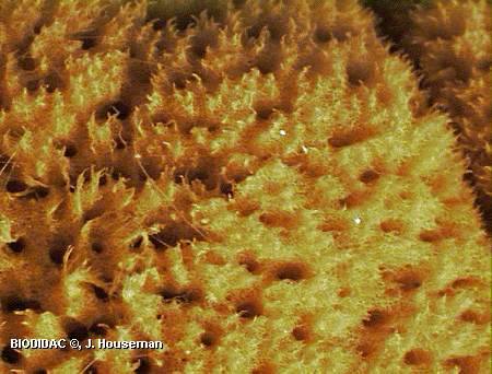 (FR) : Vue de la surface montrant le réseau de spicules principalement constitués de fibres de la protéine spongine.