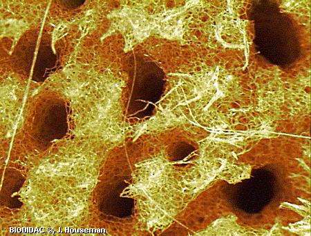 (FR) : Vue rapprochée de la surface montrant le réseau de spicules principalement constitués de fibres de la protéine spongine.