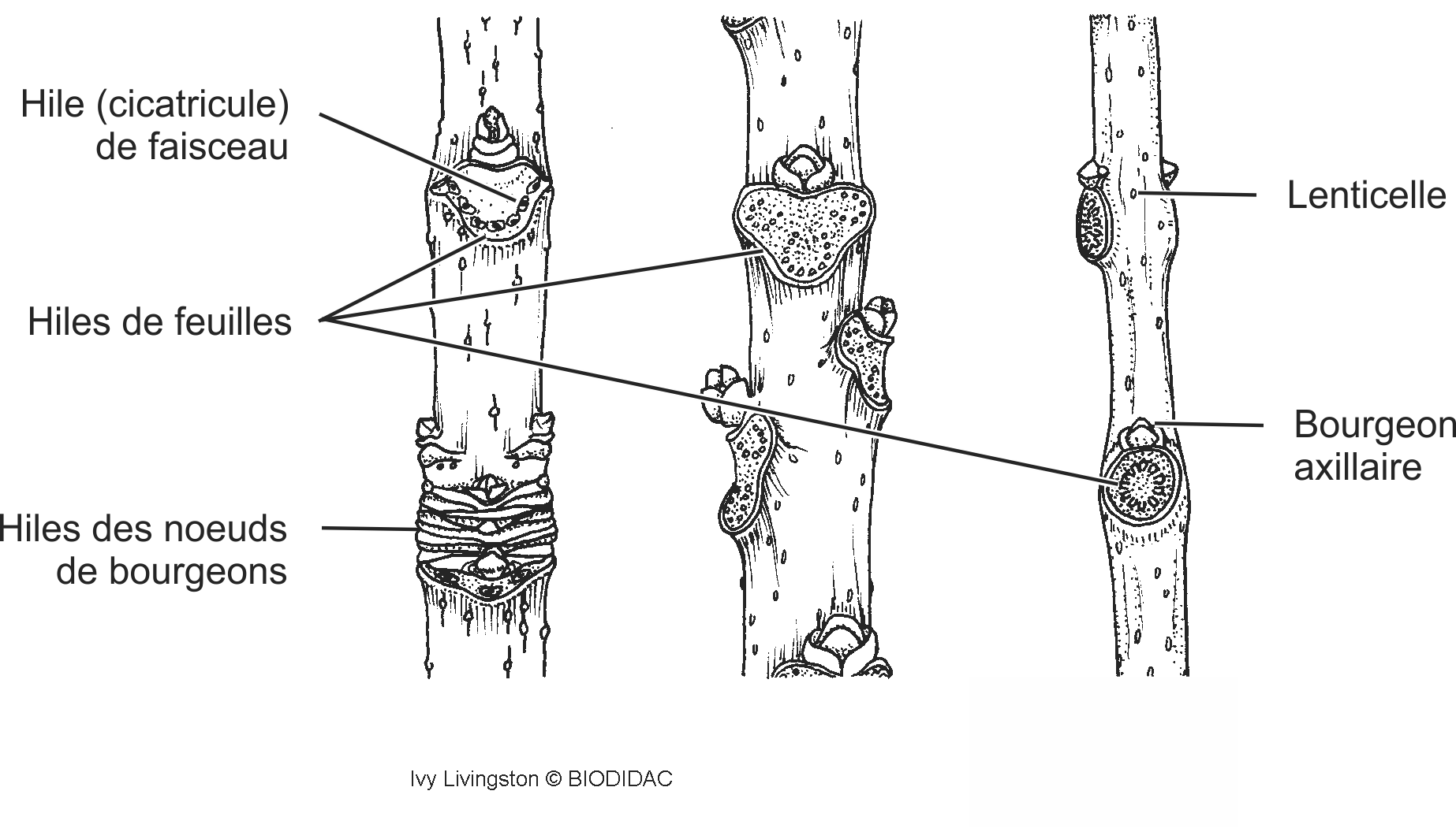 Étiquettes (FR) : Hile (cicatricule) de faisceau, Bourgeon axillaire, Hiles des noeuds de bourgeons, Lenticelle, Hiles de feuilles