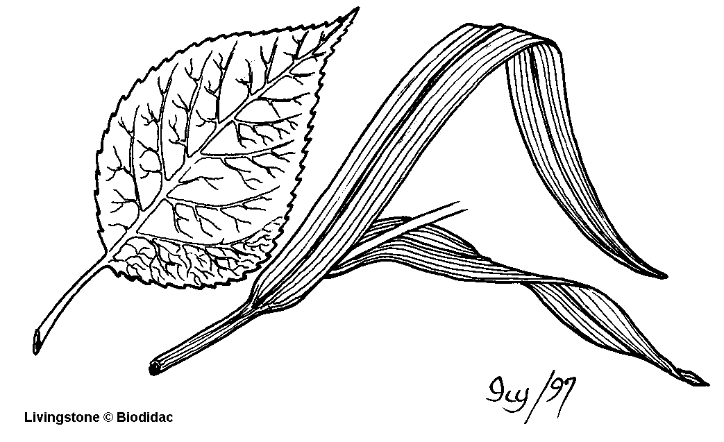 (FR) : Types de nervation des feuilles : Réticulée d'une dicotylédone (à gauche) et nervation parallèle d'une monocotylédone (à droite).