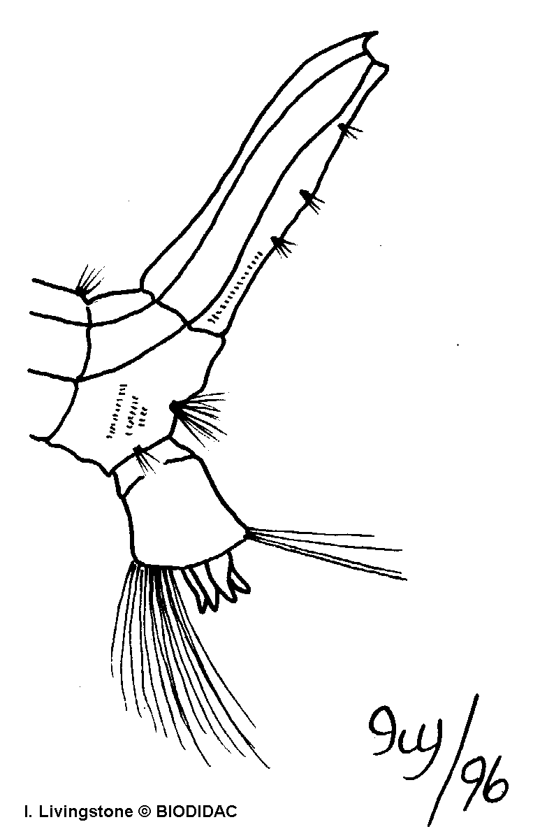 (EN) : Close-up view of the anal papillae of mosquito larvae, which are multifunctional organs that have important roles in osmoregulation and ammonia excretion: This is part of a set of three images (Dipt004b.gif, Dipt006b.gif, Dipt007b.gif) that show the changes in the size of the anal papillae of a mosquito when raised in different water salinities.