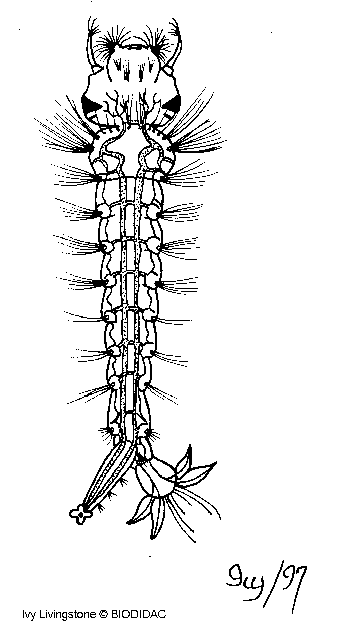 (EN) : Larva showing the internal tracheal system and its connection to the anal siphon (an example of the oligopneustic condition).