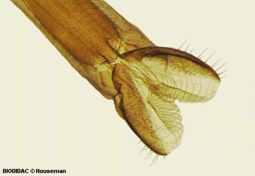 (EN) : Mouthpart: Close-up view of the tip of the labium of an adult showing its two labella (labellar lobes) (microscope slide).