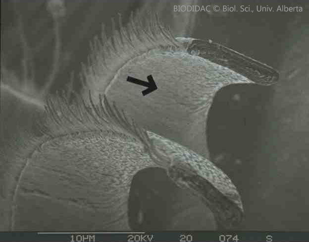 (FR) : Larve : Rayons primaires du labre par microscopie électronique à balayage (MEB).