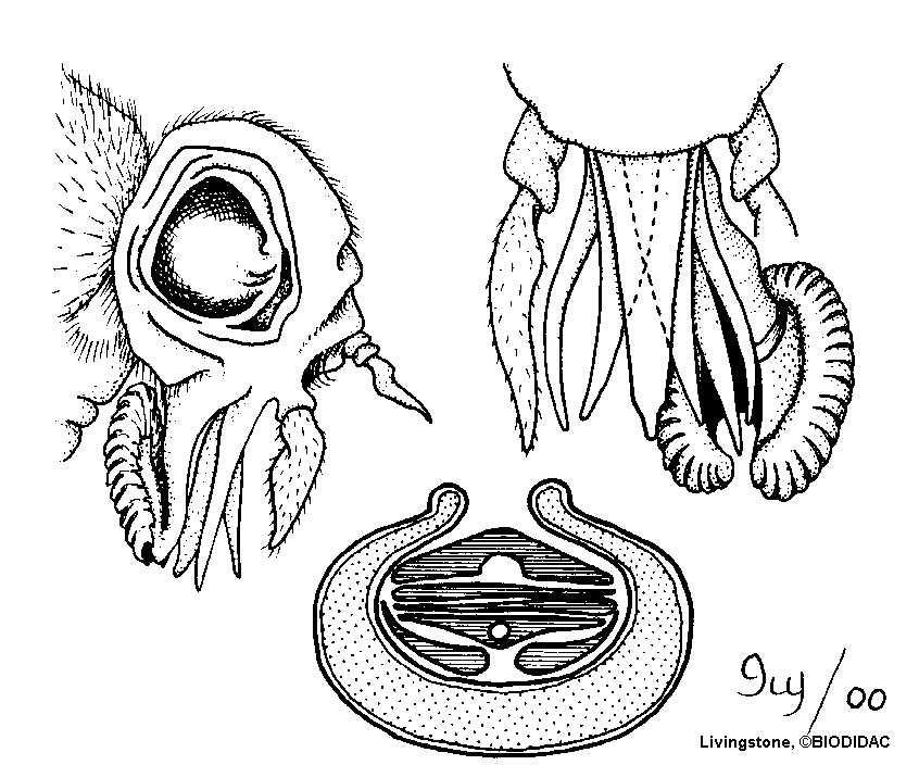 (FR) : Différentes vues des pièces buccales de l'adulte : Côté latéral (en haut à gauche), côté frontal (en haut à droite) et coupe transversale (en bas au milieu).