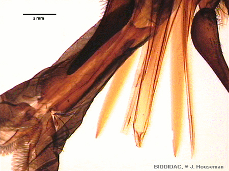 (EN) : External anatomy: Mouthparts of an adult showing the labrum (in centre), two blade-like mandibles and two blade-like maxillae (microscope slide).
