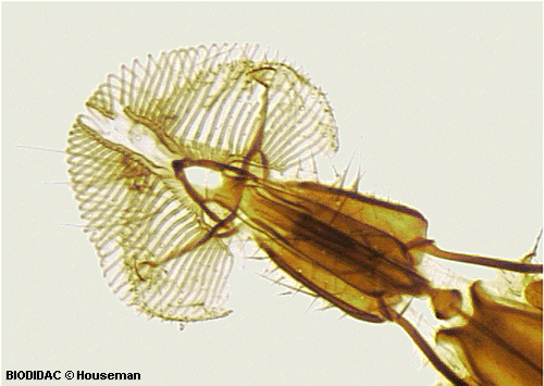 (EN) : External anatomy: Mouthparts showing the two large labella lobes and labrum (microscope slide).