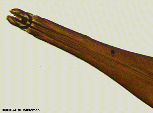 (EN) : External anatomy: Close-up view of the labium with its two labella (with teeth) at the tip (microscope slide).