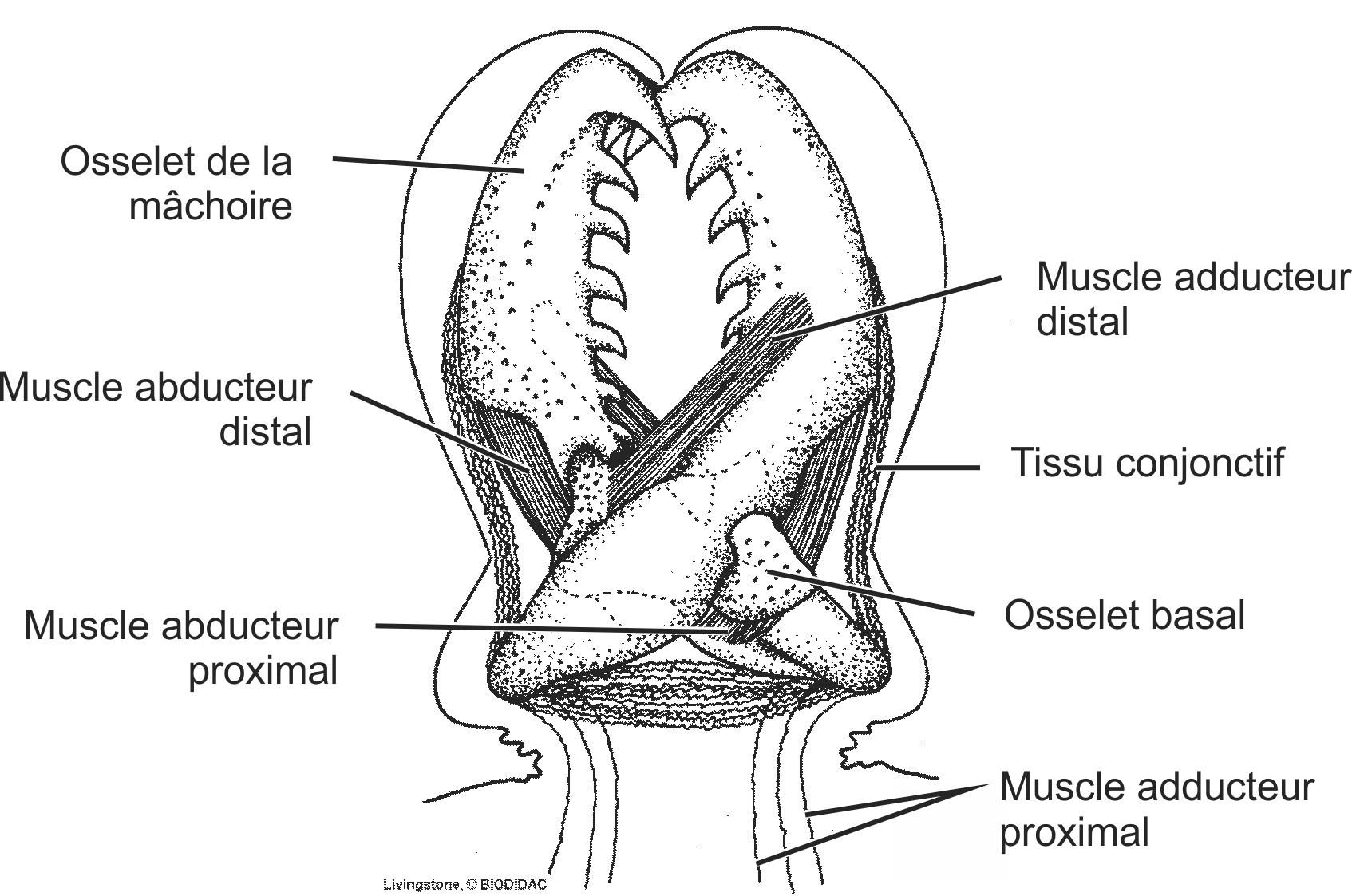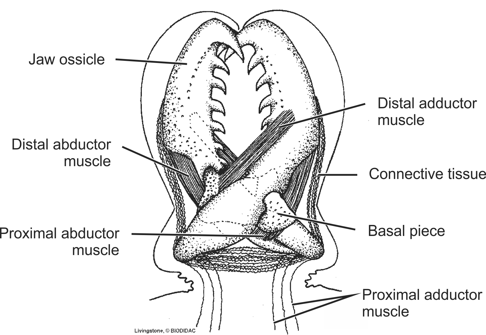 Labels (EN) : Proximal adductor muscle, Proximal abductor muscle, Connective tissue, Basal piece, Distal abductor muscle, Distal adductor muscle, Jaw ossicle
