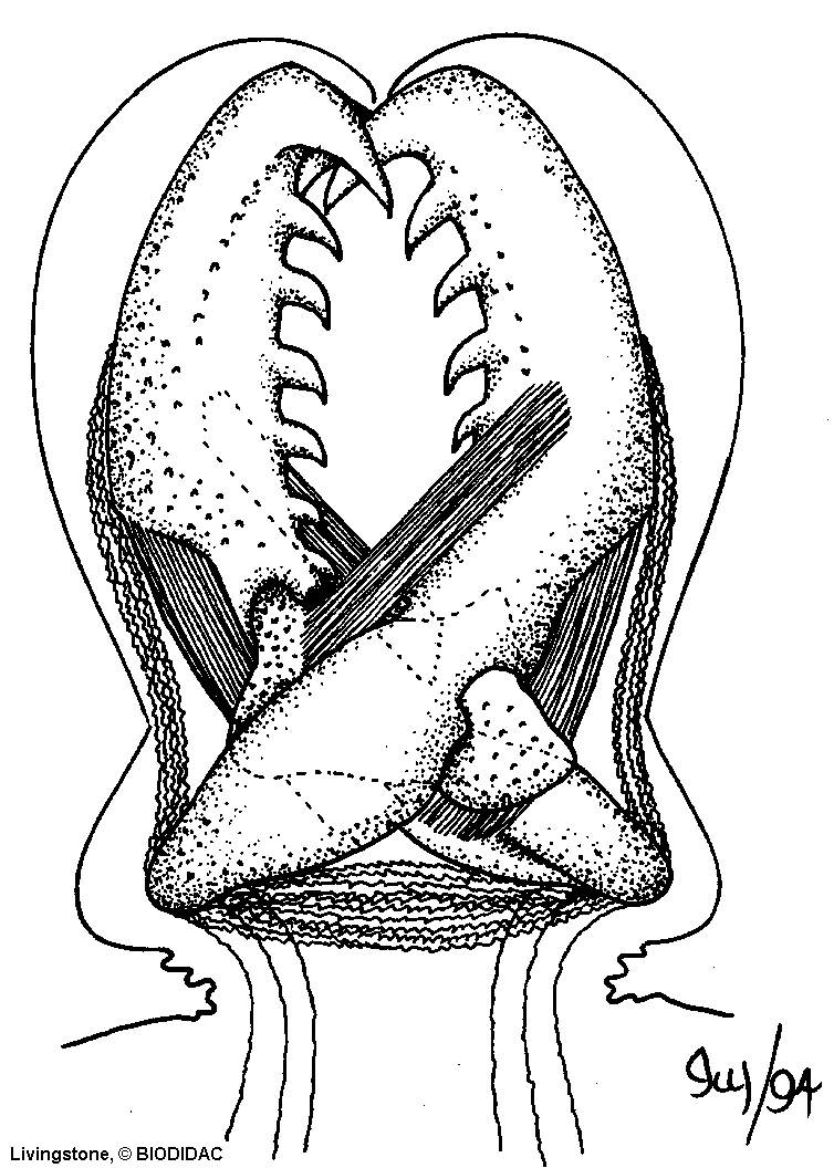Étiquettes (FR) : Muscle adducteur proximal, Muscle abducteur proximal, Tissu conjonctif, Osselet basal, Muscle abducteur distal, Muscle adducteur distal, Osselet de la mâchoire