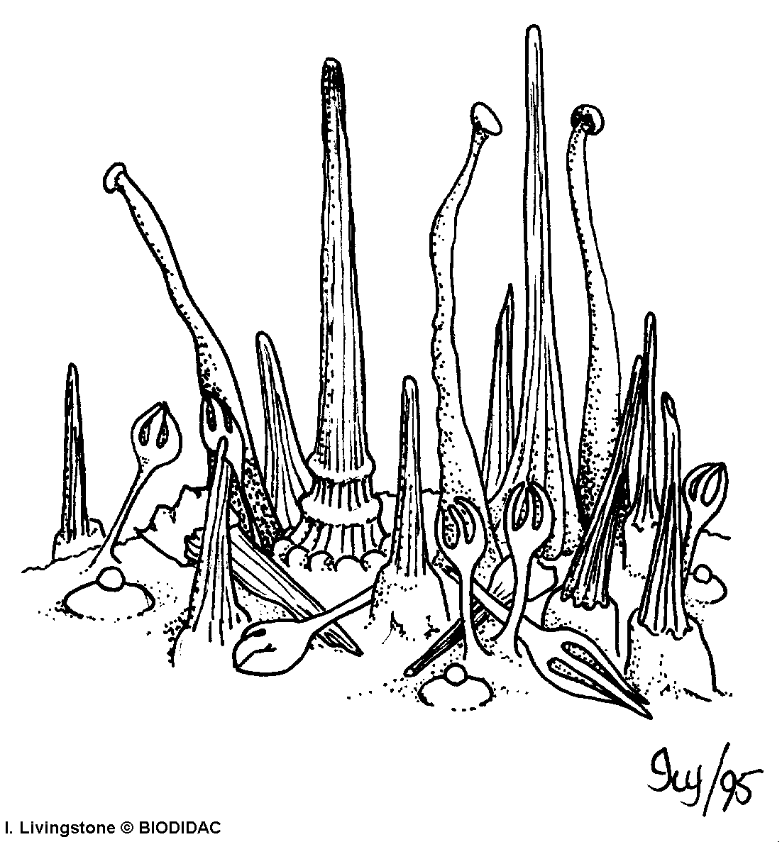 (EN) : External anatomy: Structures found on the surface of the test (skeleton), including tube feet and tridentate pedicellaria.