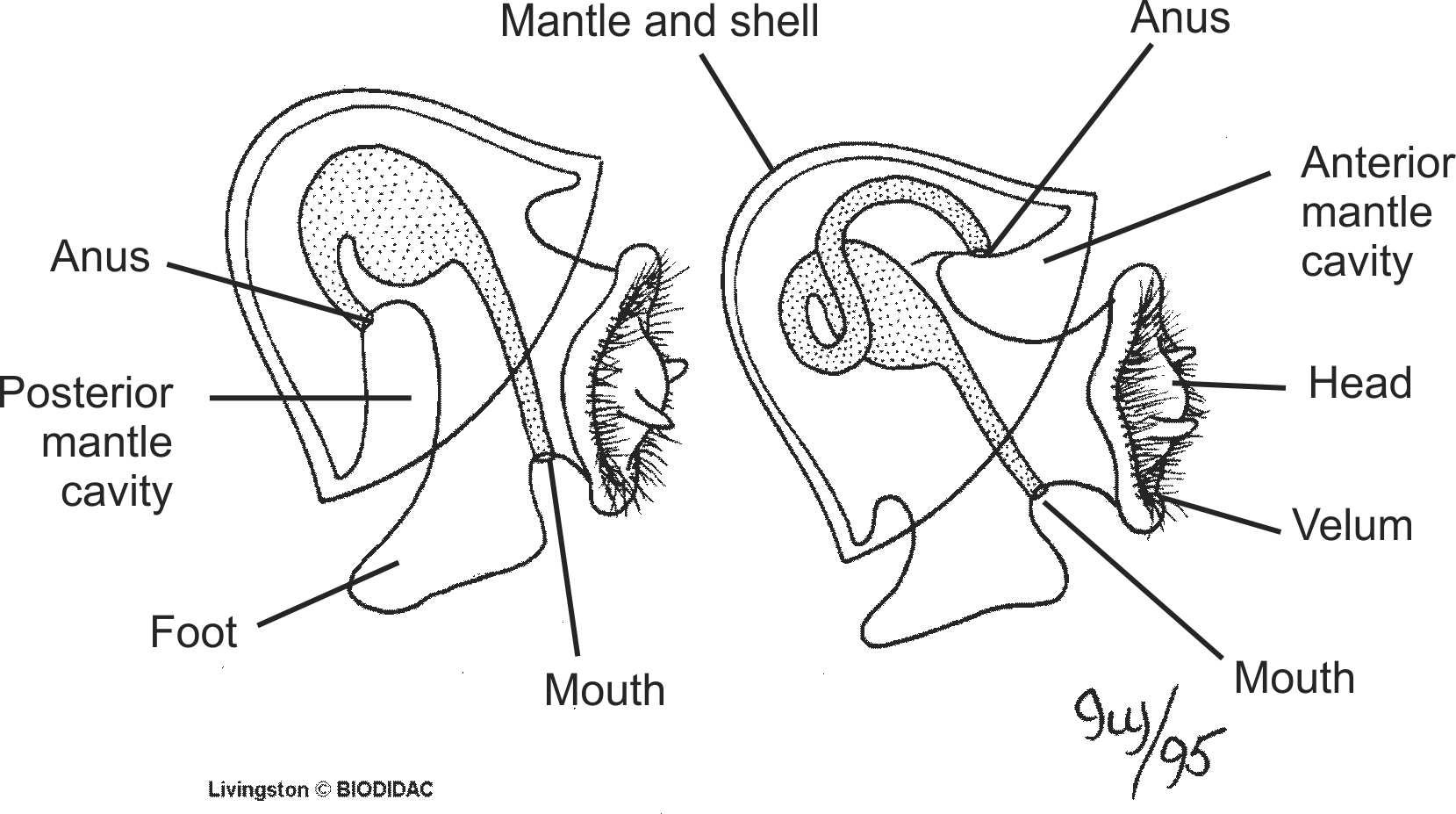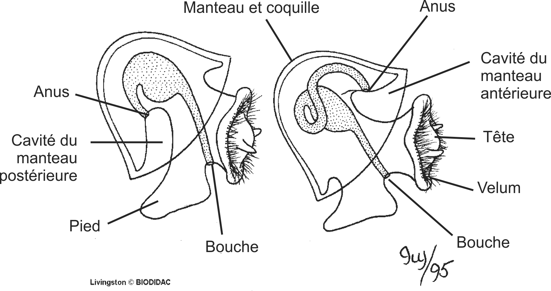 Labels (EN) : Mouth, Foot, Posterior mantle cavity, Mantle and shell, Mouth, Velum, Head, Anterior mantle cavity, Anus, Anus