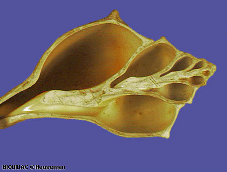 (EN) : Shell of a snail: General features of a shell cut in half and showing the internal whorl and columella.