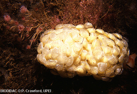 (FR) : Œufs de buccin (avec hydraire marin colonial, fourrure d'escargot ou fourrure de bernard-l'hermite ou hydractinie hérissée ou Hydractinia echinata) : Photo prise en juillet 1992 près de Saint Andrews, Nouveau Brunswick, Canada.