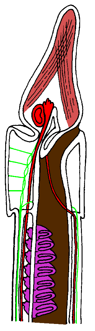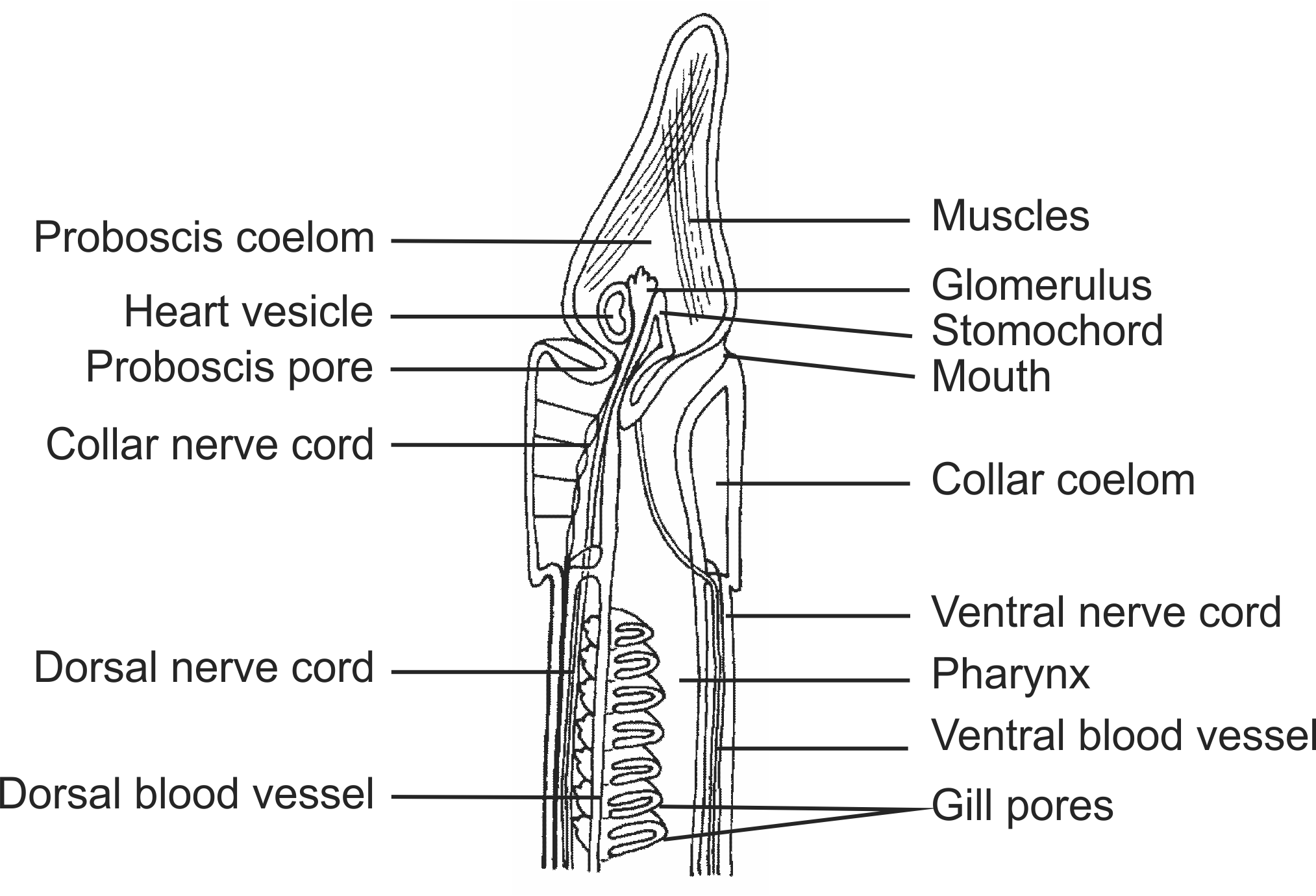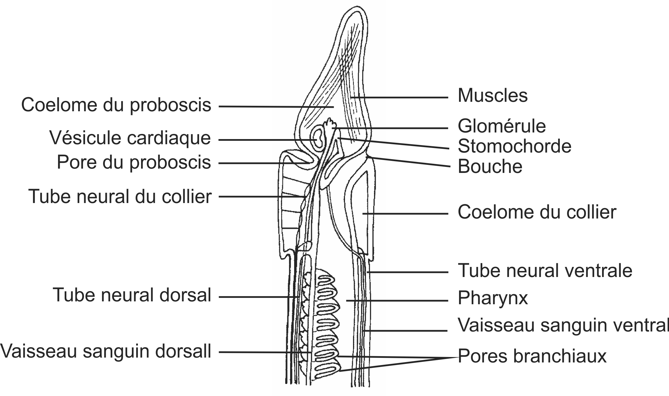 Labels (EN) : Proboscis coelom, Dorsal blood vessel, Dorsal nerve cord, Collar nerve cord, Ventral blood vessel, Ventral nerve cord, Proboscis pore, Heart vesicle, Gill pores, Pharynx, Collar coelom, Mouth, Stomochord, Glomerulus, Muscles