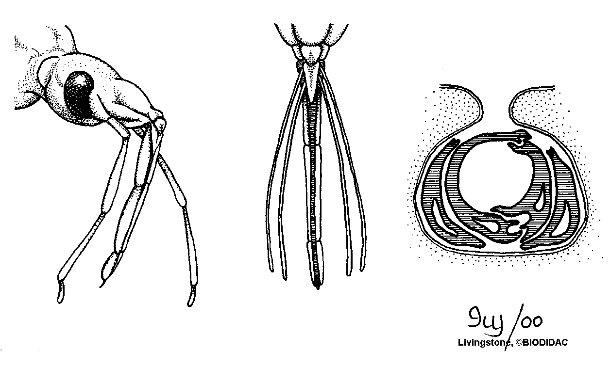 (EN) : Different views (including a cross section) of the main features of the piercing mouthparts.