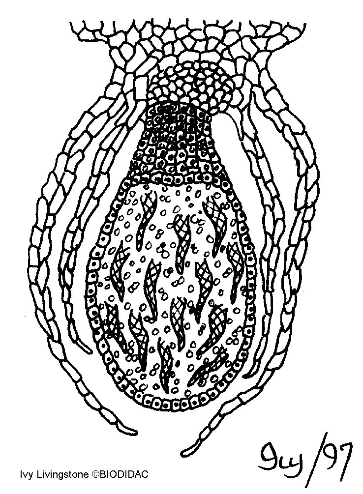 (EN) : Sporophyte: Note that it is attached to the gametophyte by a large foot and it grows through the base of the venter into the storage tissue of the archegonial head. No labels (image 1) + English labels (image 2) + French labels (image 3).