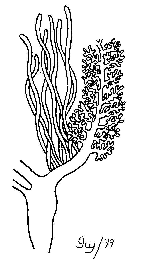(FR) : Anatomie interne : Organe arborescent servant à la respiration et tubules de Cuvier, qui sont des fils collants situés près de la base de l'organe arborescent et peuvent être expulsés pour dissuader les prédateurs.